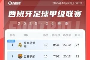 体育资讯10月28日讯 凌晨马竞客场2-0战胜贝蒂斯,至此西甲第10轮比赛全部结束。
